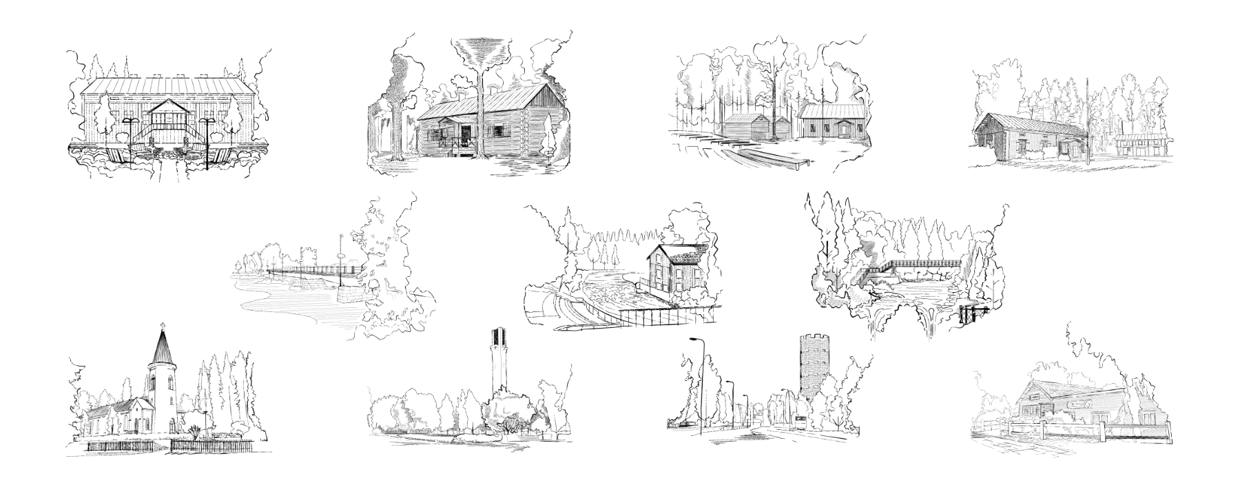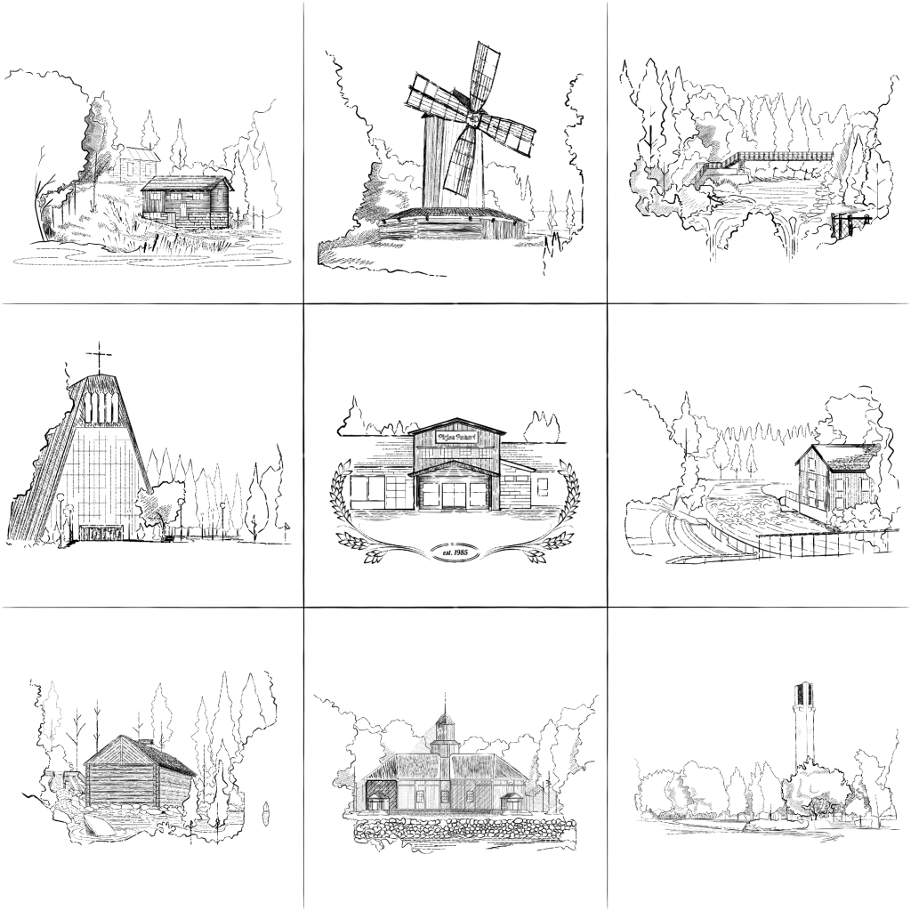 Suunnittelin ja toteutin useita paikkakuntakohtaisia kuvituksia kaikkiaan kolmesta kohteesta kuudessa eri kaupungissa, joissa sijaitsee asiakkaan toimipiste. Teoksia on siis yhteensä 18 kappaletta, sekä lisäksi yksi ylimääräinen kohde yhdelle kaupungille. Kaupunkikuvituksien lisäksi tein muutamia pieniä yksittäisiä kuvituksia. Kuvitukset tilattiin paikkakuntakohtaista markkinointia varten. Kuvitusten paikat ovat mm. Honkajoelta, Nurmijärveltä, Seinäjoelta sekä Ylivieskasta.