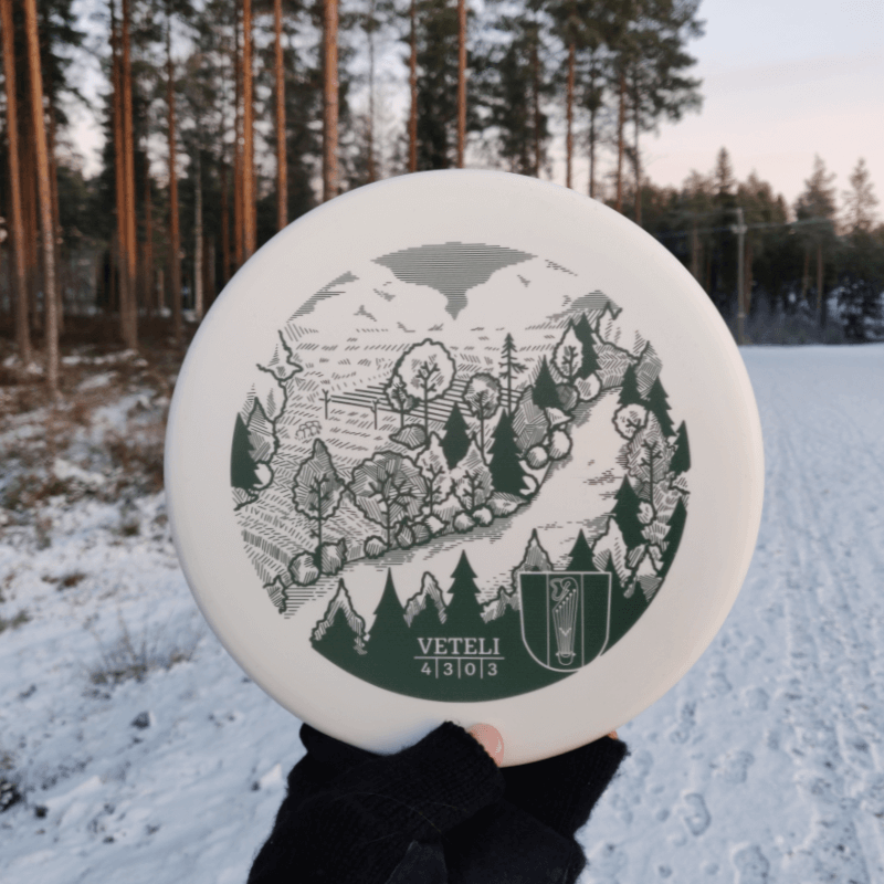 Vetelin kunta tilasi kuntamarkkinointia varten erän frisbeegolfkiekkoja, joihin sain kunnian suunnitella ja toteuttaa kuosin. Kuvituksessa on paikallismaiseman ja seinäryijyjen inspiroimana maisemakuvitus, jossa näkyy Perhonjoki.